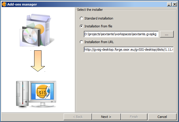 Here you can find instructions for installing the SEXTANTE gvSIG package.First of all, download the package file from [here] . Now open gvSIG and start the add-ons manager.