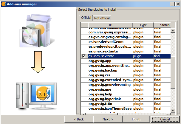 Select the es.unex.sextante add-on tchecking the corresponding textbox and press "Next". SEXTANTE is now installed in your gvSIG.